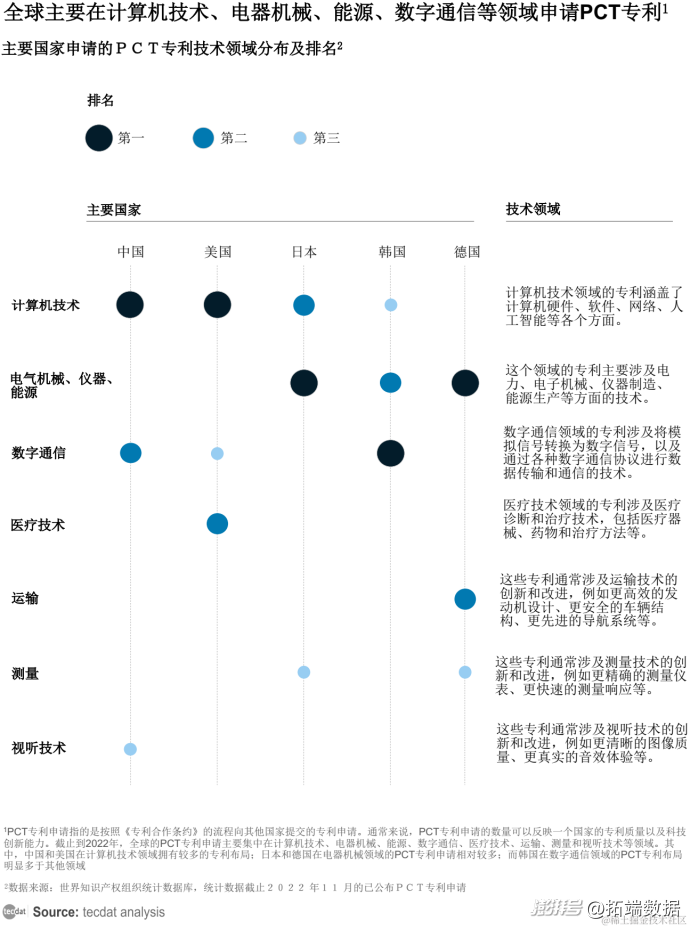 截止2022年,全球的PCT专利申请主要分布在计算机技术、电器机械、能源、数字通信、医疗技术、运输、测量和视听技术等领域。中国和美国在计算机技术领域布局了较多的专利;日本和德国在电器机械领域提起的PCT专利申请较多;而韩国在数字通信领域的PCT专利布局相对其他领域更为丰富。这些数据反映了各个国家在科技创新领域的重点和投入情况,也为未来的科技创新提供了重要的参考信息。
