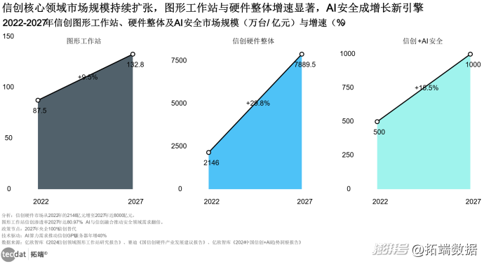信创产业的爆发式增长始于全球技术供应链重构与国内数字化转型的双重驱动。2022年中国信创硬件市场规模达2146亿元,预计2026年将突破7889亿元,年复合增长率近30%。这一进程中,央国企作为落地主力,正推动技术从党政领域向金融、能源等八大行业深度渗透,而AI与信创的融合正重塑产业生态边界。