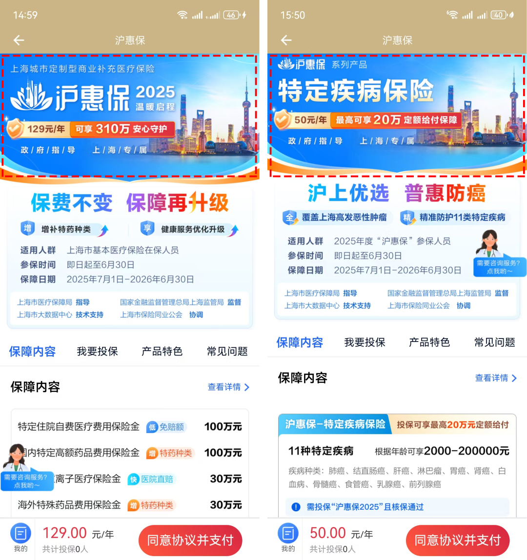 ✅ 新增特疾险双保险:50元/年“沪惠保-特定疾病保险”,覆盖肺癌、乳腺癌等11类上海高发癌症,确诊即赔最高20万元,与主险形成“报销+定额”双重保障!