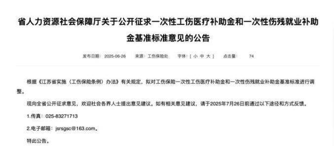 江苏省人社厅6月26日发布公告,拟就调整全省一次性工伤医疗补助金和一次性伤残就业补助金基准标准公开征求意见。