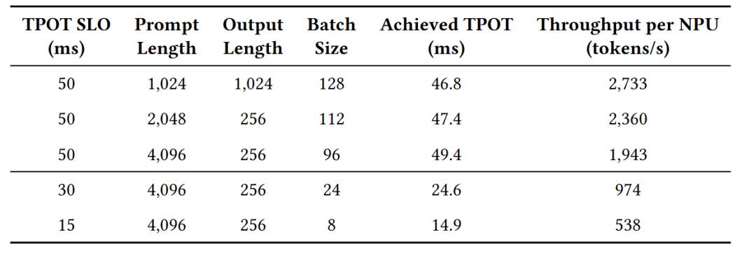 并且在TPOT<50ms的约束下,解码吞吐量达到了1943 token/秒/每NPU,即使收紧至TPOT<15ms,仍能维持538 token/秒,这就验证了全对等互联在严苛延迟场景下的稳定性。