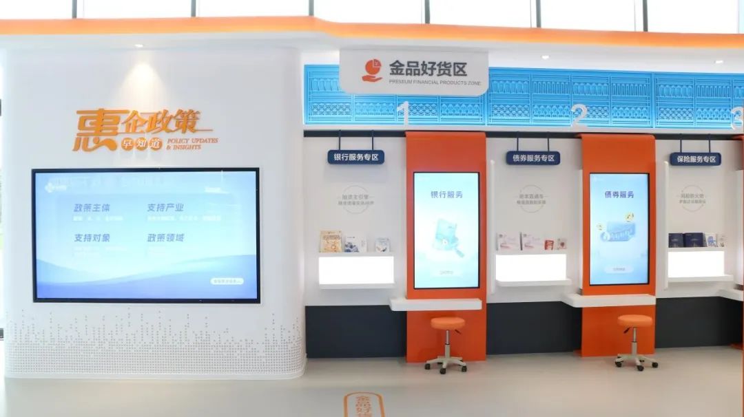 金品展示区域重点展示金融机构产品、市级转贷资金产品及数字人民币平台、场景;金心服务区(政融E站)依托政务服务咨询点,叠加金融服务咨询等功能,设置政务服务及金融服务机具,便利企业同步享受政务服务和金融服务;