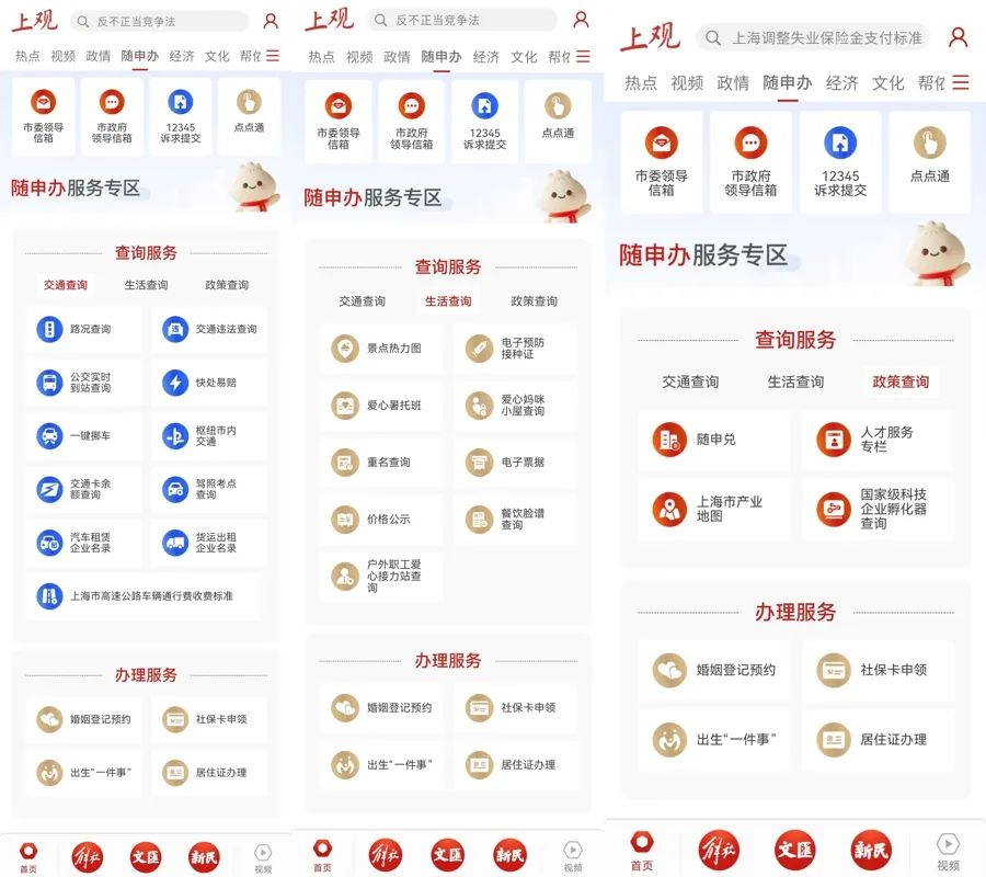 “随申办”首批32个高频服务功能嵌入上观新闻此次嵌入上观新闻的“随申办”高频服务主要包括投诉建言服务、办事服务、查询服务三大类。其中,投诉建言服务包括市委领导信箱、市政府领导信箱、“12345”诉求提交、点点通等。