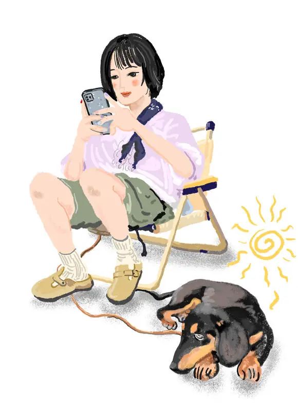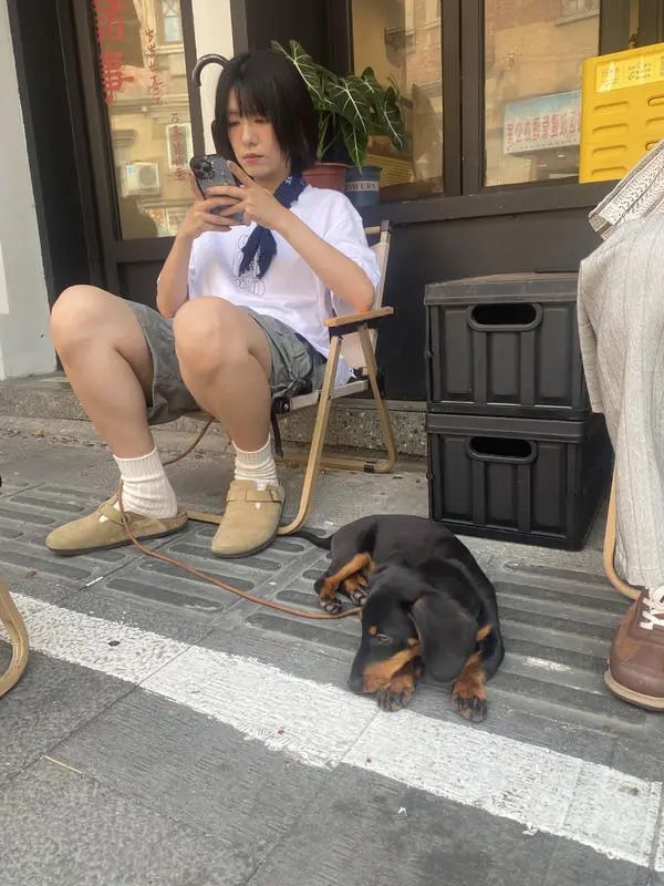 被牵着的腊肠犬,百无聊赖地趴着放空。狗主人下班后的时光甚是惬意。