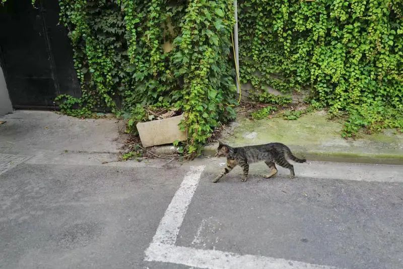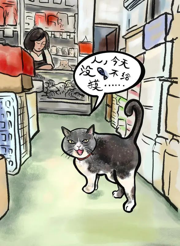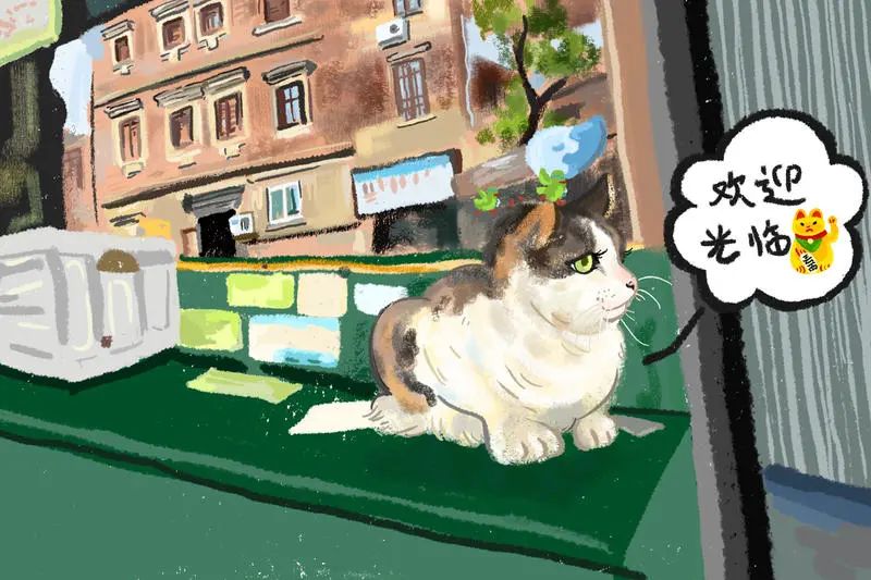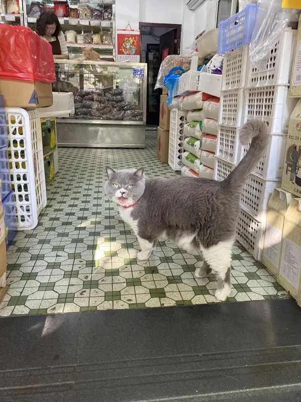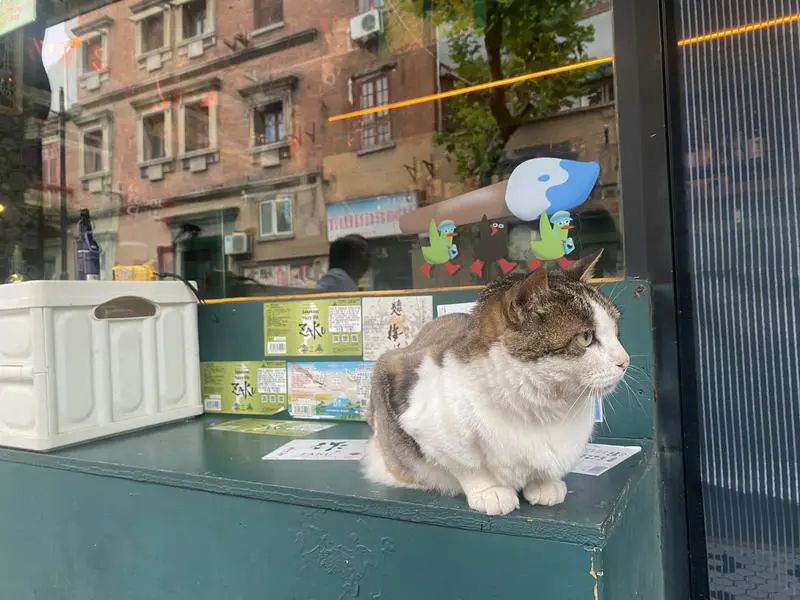 绿眼睛的喵星人只在主人店门口的两米范围溜达,认家还不怕生——它是这条街上情绪最稳定淡定的仔。