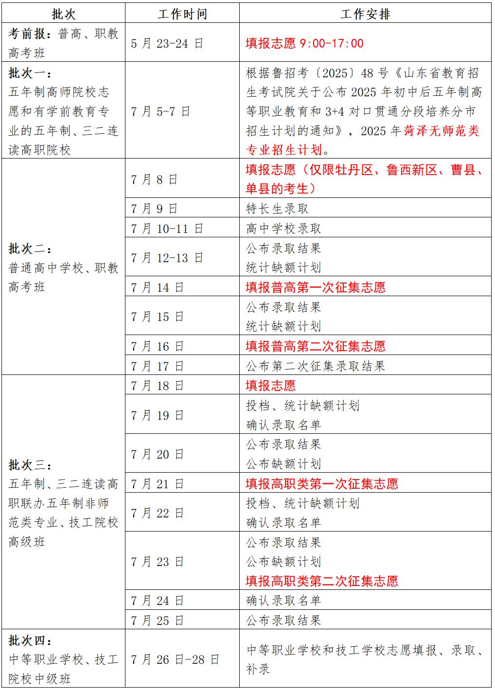 菏泽市2025年高中阶段招生志愿填报、录取时间安排