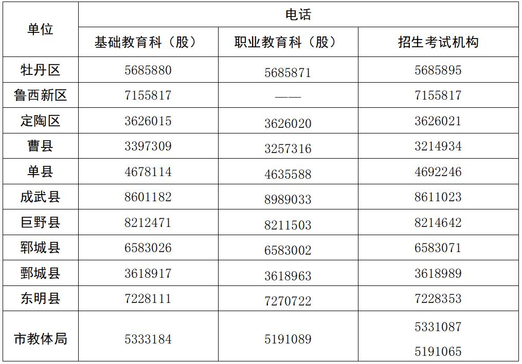 菏泽市2025年中考招生咨询电话表