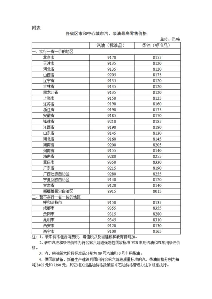 根据近期国际市场油价变化情况,按照现行成品油价格形成机制,自2025年7月1日24时起,国内汽、柴油价格(标准品,下同)每吨分别上涨235元和225元。调整后,各省(区、市)和中心城市汽、柴油最高零售价格见附表。