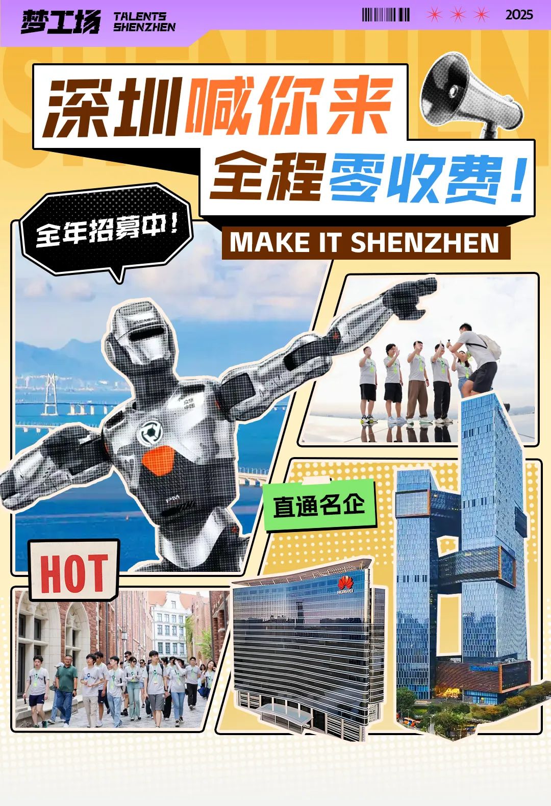 “Make It Shenzhen”全球英才深圳行是深圳市人才工作局、深圳市人才研修院联合主办的官方人才品牌活动,面向全球英才,通过参观交流、文化研习、都市漫步、政策宣讲、大咖对话、山海健行、美食打卡,深入体验粤港澳大湾区和先行示范区的无限机遇和独特魅力。现已助力逾40名学员实现就业与科创项目对接,包括到中山大学(深圳)、哈工大(深圳)等重点高校深造,进入华为、比亚迪等知名企业就业,获得迈瑞医疗、中科院深圳先进技术研究院等实习机会,以及创业项目成功落地深圳南山,或加入创业团队,等等。The "Make It Shenzhen" Global Talent Study Tour is a talent brand activity co-hosted by Shenzhen Municipal Talent Affairs Bureau and Shenzhen Talent Institute. It invites global talents to experience the unique charm of the Guangdong-Hong Kong-Macao Greater Bay Area and the pilot demonstration area through visits and exchanges, dialogues between high-calibre experts, walking cultural studies and policy lectures. It has facilitated over 40 talents in matching with employment opportunities and innovation projects in Shenzhen, including advanced studies at Sun Yat-sen University (Shenzhen) and Harbin Institute of Technology (Shenzhen),employment at leading companies like Huawei and BYD, internships at Mindray and the Shenzhen Institute of Advanced Technology (Chinese Academy of Sciences), startup success, with entrepreneurial projects established in Shenzhen's Nanshan District or joined in entrepreneurial teams.