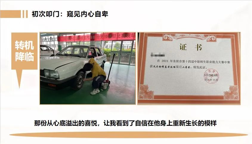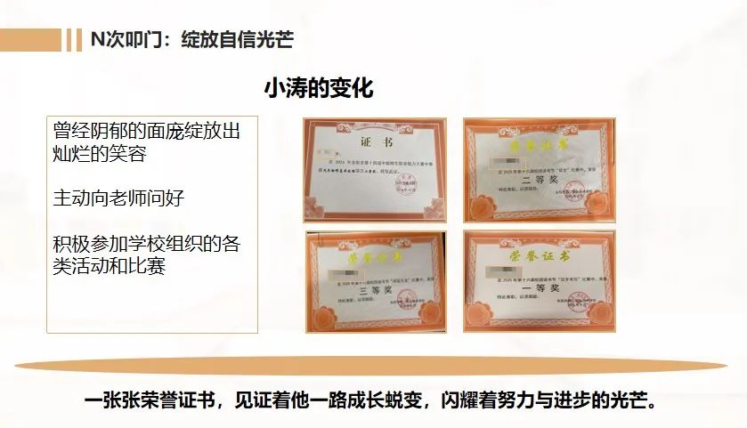 N次叩门 绽放自信光芒自家访后,小涛发生了翻天覆地的变化。他积极投身学校各类活动与比赛,斩获颇丰,读书节汉字书写比赛获一等奖、征文比赛获二等奖,技能节发动机拆装比赛也摘得二等奖。一张张荣誉证书,是他成长蜕变的勋章,闪耀着努力与进步的光芒。更令人欣喜的是,他的抗抑郁药量逐渐减少,开始主动倾诉内心感受,积极参与集体活动,整个人变得自信又阳光。
