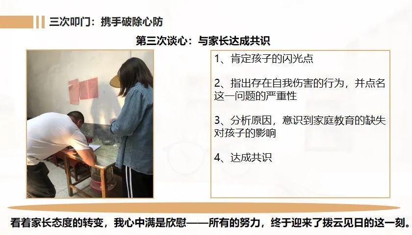 三次叩门 携手“魔丸”破除心防一天午饭后,小涛趴在桌上似在哭泣,称肚子痛想回家休息。我联系他爸爸却被以工作忙为由拒绝,我意识到解决小涛心理问题需家校携手,我再次联系小涛父亲,并约定好家访时间。