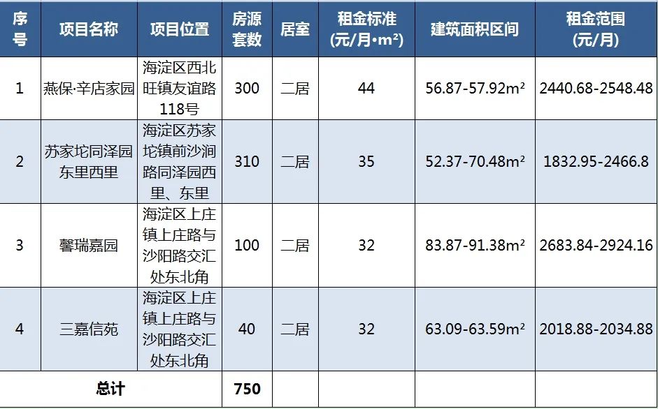 此次配租项目为燕保·辛店家园、苏家坨同泽园东里西里、馨瑞嘉园、三嘉信苑4个项目750套房源,均由北京保障房中心有限公司持有并运营。具体情况如下: