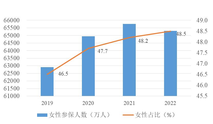 2019—2022年妇女参加基本医疗保险的人数(万人)及比重(%)