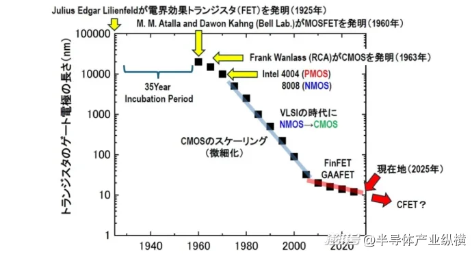 图 1:场效应晶体管 (FET) 发明 100 周年。来源:VLSI Symposium 2025,特别研讨会,Kazuhiko Endo 教授(东北大学)
