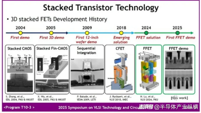 图 9 3D 堆叠 FET 的历史。来源:VLSI Symposium 2025,T10-3,吴恒(北京大学),幻灯片“在 300 毫米晶圆上首次实验演示倒装 FET(FFET)中的双面 N/P FET,用于亚 1nm 节点的堆叠晶体管技术。”
