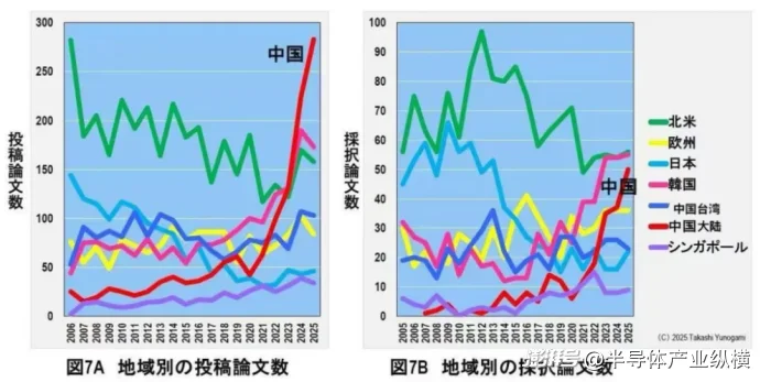 图 7显示了 VLSI 研讨会上技术(设备/工艺)和电路领域按地区提交和接受的论文数量。