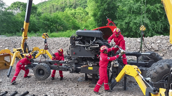 破碎锤、液压树剪、抓石器、岩石锯等机具,被巧妙设计成标准化“积木”,一架直升机就能将它们分批空投到断路的核心区。“落地后,一台多功能的模块化步履式挖掘机就能快速组装完成!”中国安能集团唐山救援基地队员任成飞介绍说,传统的挖机由于自身重量比较大,一般的直升机很难运进灾区实施救援。如今化整为零,拼装即用,彻底解决了断路“拦路虎”。该设备依托智能控制系统,可进行本地或遥控操作,在复杂地形环境下高效实施破碎、剪、抓、锯、夯、钻、挖等多种作业,从而全面满足恶劣环境下的多样化抢险救援需求。新型水陆两栖长臂挖掘机