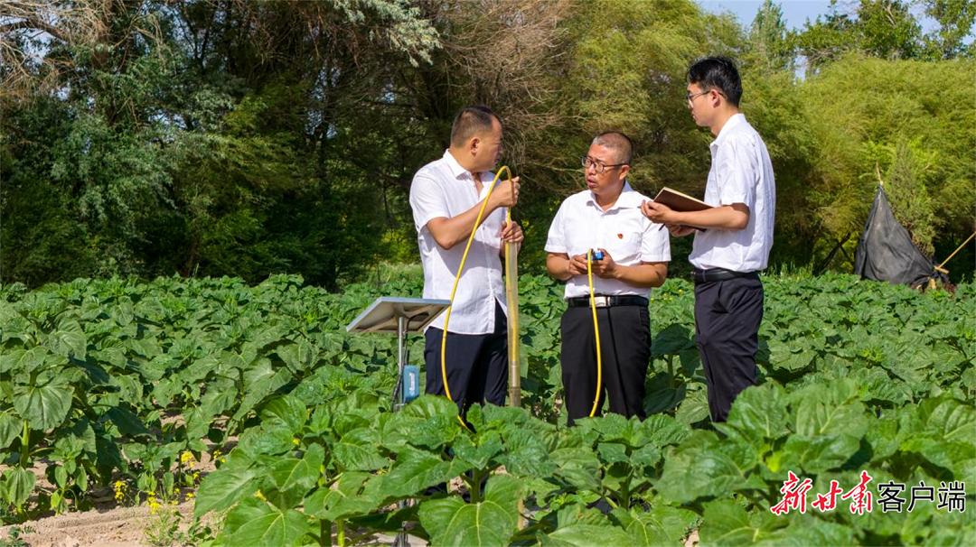 工作人员在试验田采集土壤样品。本文图片均由甘肃省疏勒河流域水资源利用中心提供试验综合运用烘干法与TDR法两种方法进行实测校核,利用土壤墒情站实现试验田0至30厘米土层的含水率和温度的持续监测。通过双因素对照试验,系统探究数字孪生示范区内食葵生长发育的适宜灌溉水量、土壤含水率阈值以及经济效益最优区间和有效水利用率,为疏勒河流域智能灌溉模型构建、食葵水肥一体化技术推广和滴灌制度优化提供科学理论依据。