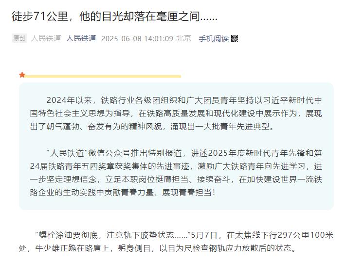 “看着一列列满载物资的列车从站内安全驶出,我觉得很值得,很有成就感。”牛少雄以责任担当守护着太焦线运输动脉。文字:孙帅(融媒体中心)何高波(月山工务段)