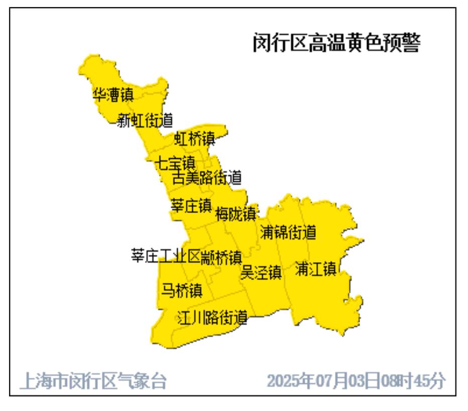 上海市闵行区气象台2025年07月03日08时45分发布高温黄色预警信号:
