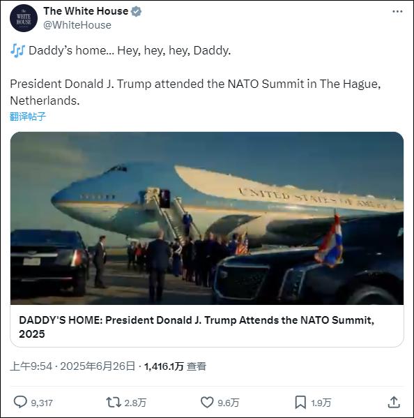 报道称,吕特的“爸爸说”,也很快被白宫方面加以炒作。后来,白宫在其社交媒体X平台账号发布了一分多钟的视频,回顾了特朗普重回北约峰会的画面,并使用了亚瑟小子的歌曲《爸爸回来了》(Daddy’s Home)作为背景音乐,甚至配文写道:“爸爸回来了…嘿嘿嘿,爸爸。(Daddy’s home… Hey,hey,hey,Daddy.)”