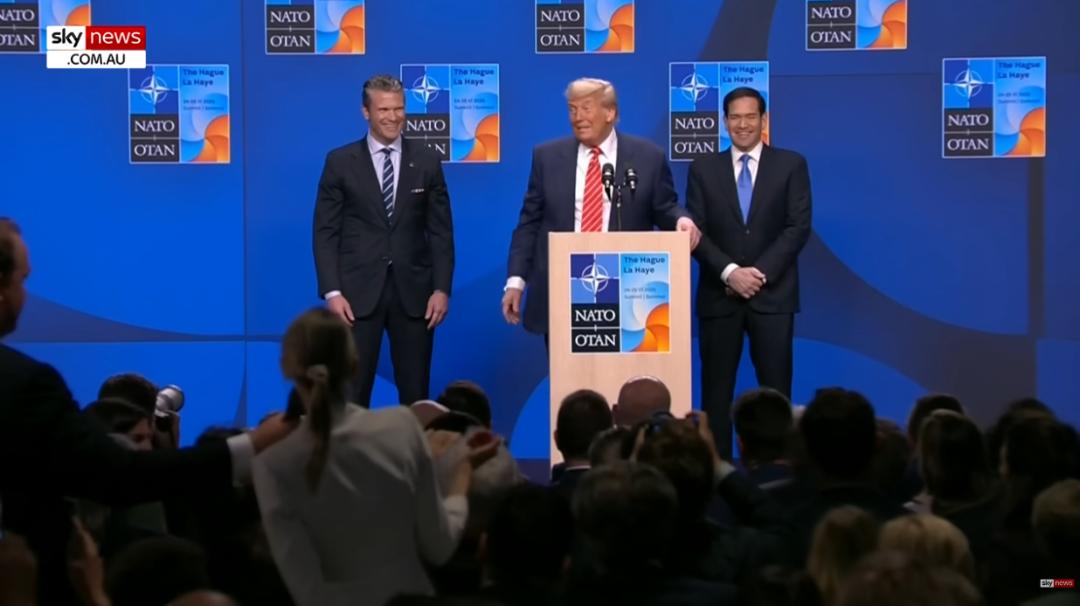 特朗普笑着回答记者提问,身后的鲁比奥与赫格塞思也忍不住笑起来。 视频截图此外,为了确保特朗普能够飞往荷兰海牙参加北约峰会以及峰会顺利举行,北约秘书长吕特不仅提前让成员国满足特朗普将国防预算提高至GDP(国内生产总值)5%的要求,还发私信拍特朗普马屁。