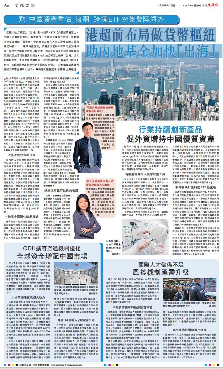 近期,内地公募基金“出海”动作频频,数只跨境ETF产品登录海外市场。“中国资产重估”浪潮正以前所未有的力度加速推进,为海外投资者布局中国优质资产提供更加便利和丰富的渠道。近日,我院经济与金融系教授阮青松就此接受《香港文汇报》采访,以下为刊发原文。