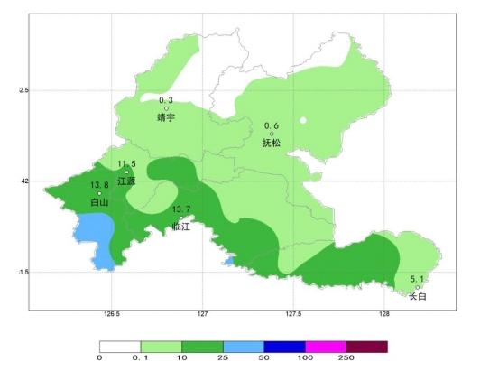 7月3日08时至7月3日18 时我市出现降水天气,全市过程平均总降水量为8.0mm,各县(市、区)平均降水实况为:浑江区21.8mm、长白县12.5mm、临江市12.4mm、江源区9.0mm、抚松县1.1mm、靖宇县0.7mm。最大降水量出现在浑江区四道岔43.6mm,6 站出现大雨,降水量排名前3 位分别是:浑江区四道岔43.6mm,浑江区红土崖35.0mm,浑江区大青沟28.7mm。1站出现短时强降水,为浑江区四道岔27.6mm。