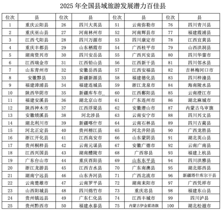 2025年全国县域旅游发展潜力百佳县分布在21个省份。四川最多,占13席;江西占12席,云南和福建8席。重庆云阳、重庆巫山、江西弋阳、重庆丰都、湖南资兴、江西瑞金、山东青州、安徽黟县、福建漳浦、陕西华阴位列前十。