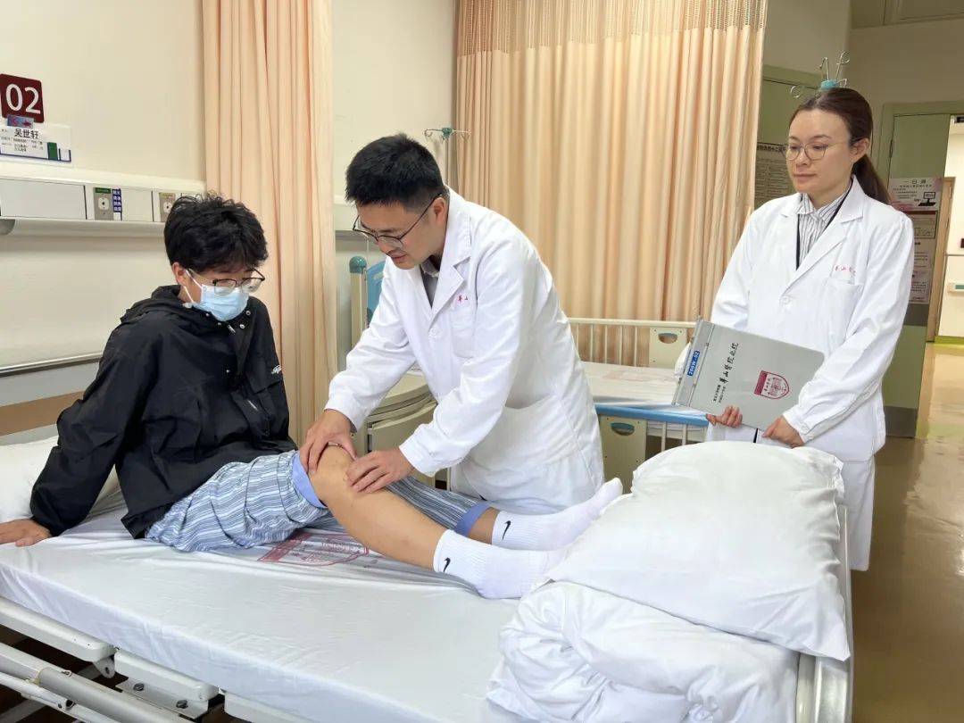 华英汇和张树蓉为小吴进行检查“就像绕道走,新韧带不钻危险的‘骨头隧道’,而是沿着股骨外侧髁的后缘‘溜边’固定住。”华英汇解释道,这就能有效避免在股骨侧钻取骨道,从而将损伤骨骺的风险降至最低,手术时间也相对缩短,更契合青少年患者的耐受度。当然,这种“绕道”技术对手术团队要求也很高,不仅位置要卡得毫厘不差、防止滑脱,“新韧带”绷紧的力道也得恰到好处,非常考验主刀医生的精准“手艺”。