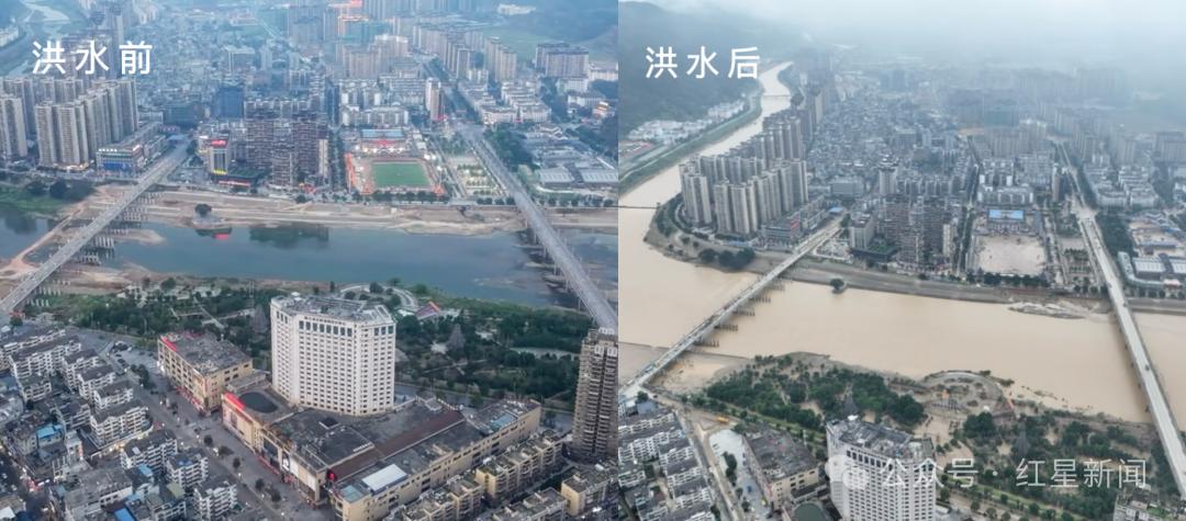 洪水前后的榕江县城6月24日到28日,短短四天,贵州榕江已被洪水吞噬两次。这个以“村超”出圈的小县城,就这样,被按下了暂停键。昔日活力四射的“村超”赛场,也在洪水的肆虐下,化作一片狼藉的泽国。这场突如其来的大雨让遭受洪水重创的榕江城时刻牵动着全国人民的心。
