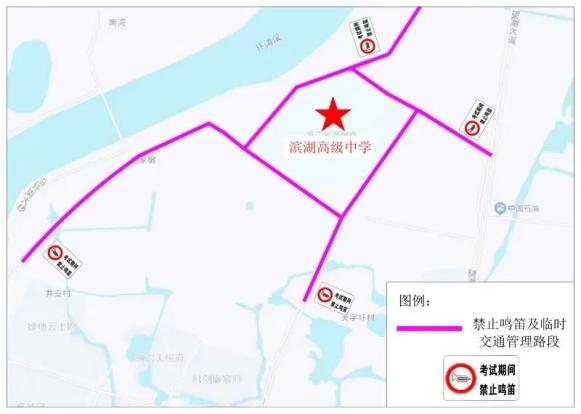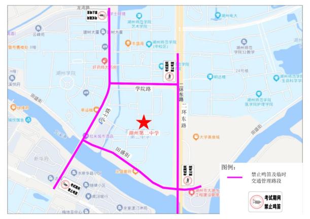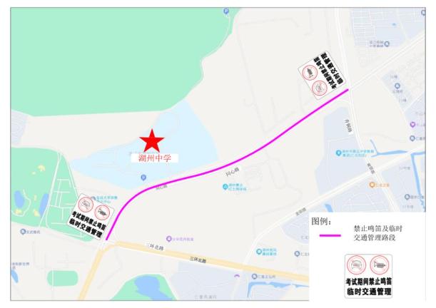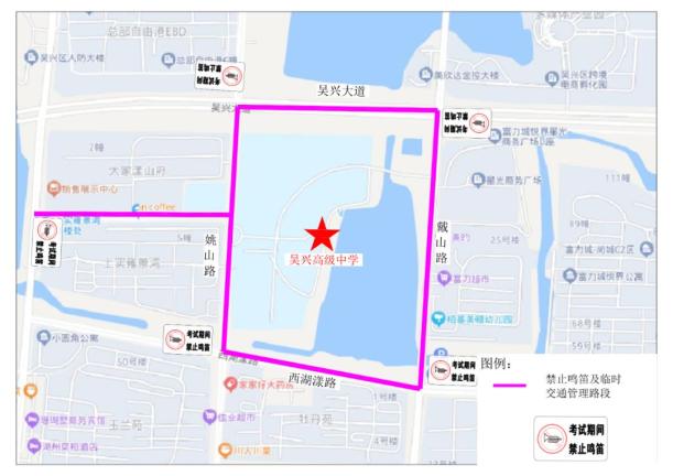 对姚山路(吴兴大道至西湖漾路)、戴山路(吴兴大道至西湖漾路)、吴兴大道(姚山路至戴山路)、西湖漾路(姚山路至戴山路)、映日路路段实行禁鸣喇叭并视情采取临时交通管理措施。在不影响社会车辆通行情况下,接考生车辆可沿姚山路、戴山路单边水平停放。