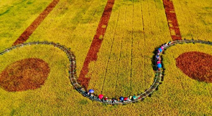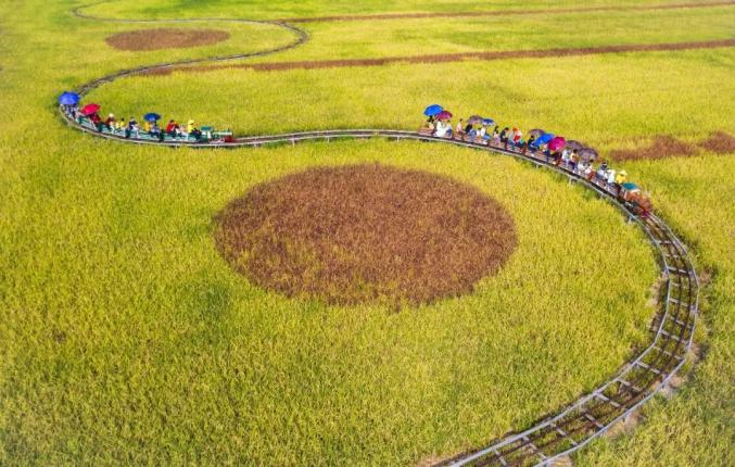 游客在阿农湾农耕文化园乘坐小火车。吴宇摄