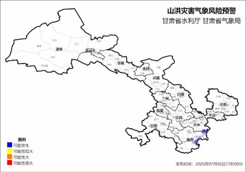 甘肃省水利厅、甘肃省气象局于2025年7月5日17时联合发布山洪灾害气象风险蓝色预警: