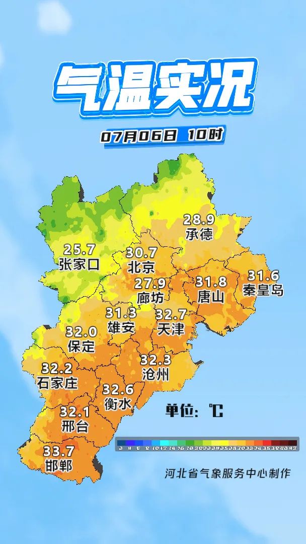 目前河北省中南部气温普遍在30~32℃左右