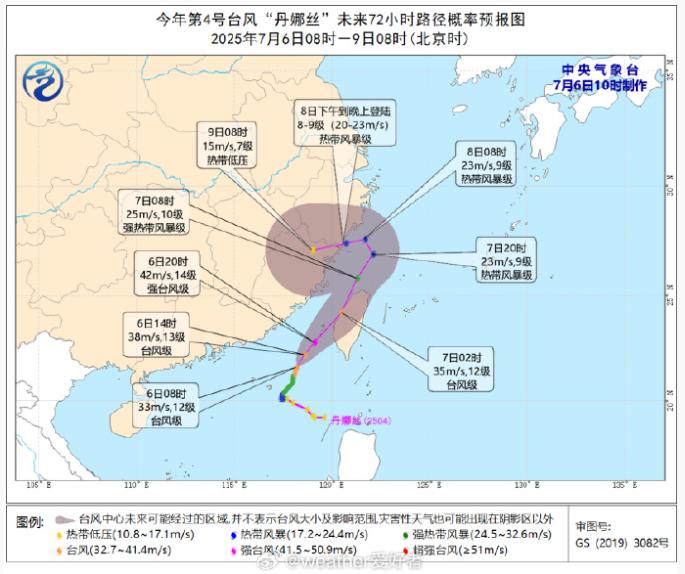 据中央气象台消息,预计,“丹娜丝”将先回旋少动,之后逐渐转向北偏东方向移动,强度逐渐增强,最强可达台风级;穿过台湾海峡之后,可能于7日夜间至8日上午在福建北部至浙江沿海登陆。