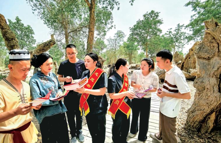 图为新疆维吾尔自治区阿瓦提县人民法院旅游巡回法庭的法官在该县刀郎部落景区向游客和景区服务商家开展普法宣传。治安防控体系更加完善