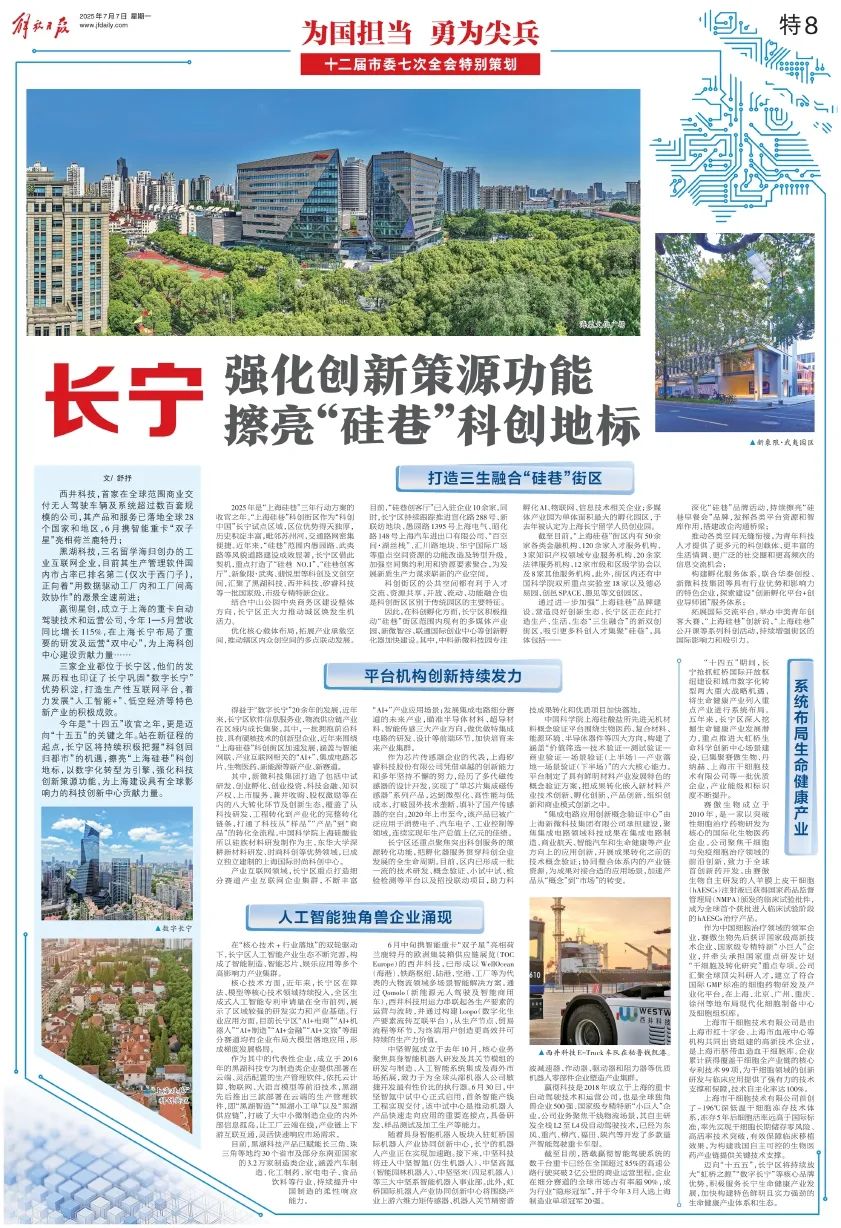 今天(7月7日),解放日报特8版刊登了《长宁 强化创新策源功能 擦亮“硅巷”科创地标》一文。着重介绍了长宁是如何把握“科创回归都市”的机遇,擦亮“上海硅巷”科创地标,推动新质生产力加快发展跃升,为上海建设具有全球影响力的科技创新中心贡献力量……