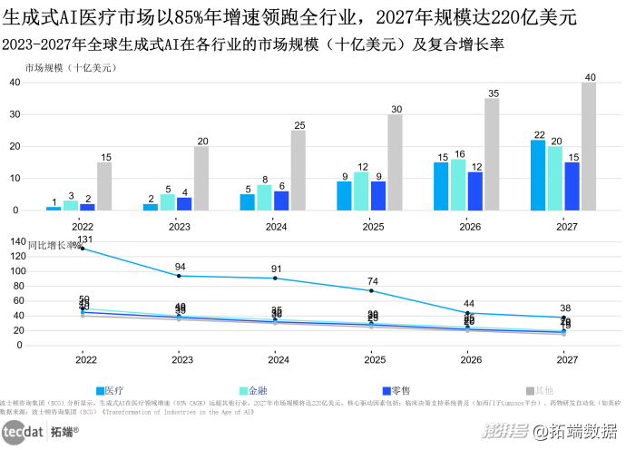 生成式人工智能在医疗领域的增长态势远超其他行业,成为驱动产业变革的核心引擎。根据世界经济论坛与BCG联合研究,2023年医疗GenAI市场规模约20亿美元,而到2027年将飙升至220亿美元,年复合增长率(CAGR)高达85%,显著高于金融行业的44%和零售行业的38%。这一增速反映出AI在解决医疗资源短缺、提升诊断效率等核心痛点上的独特价值。从技术应用看,GenAI正从辅助工具向核心决策系统演进。例如,在医学影像分析中,基于Transformer架构的大模型已实现99.9%的胰腺癌早期诊断准确率,超越传统人工阅片水平。这种突破不仅体现在精度提升,更推动诊疗流程从“被动响应”向“主动预测”转型——通过整合患者基因组、影像、临床病史等多模态数据,GenAI可构建动态疾病预测模型,提前识别高风险人群。GenAI在医疗领域的可及市场增长趋势