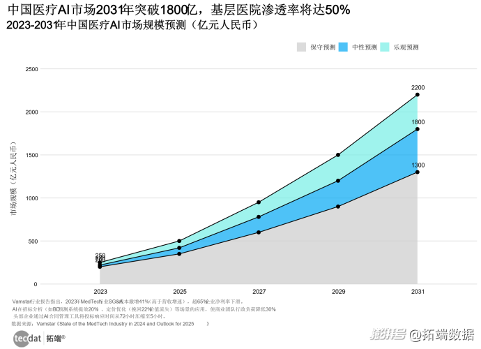 中国医疗AI市场正迎来政策与需求的双重驱动,智药咨询预测,2023年市场规模约200亿人民币,到2031年将达1800亿人民币,年复合增长率维持在25%以上。政策层面,《卫生健康行业人工智能应用场景参考指引》等文件细化84个应用场景,推动AI在基层医疗的落地,预计2025年基层医院AI渗透率将超50%。本土化创新与区域差异化成为市场亮点。讯飞医疗的“一体两翼”框架以医学知识自学习为底座,实现基层常见病全覆盖;而华西医院与润达医疗联合研发的“睿兵Agent”,聚焦消化领域,通过“三位一体”引擎解决AI幻觉问题,提升基层诊断可信度。这种“大医院技术下沉+基层场景适配”的模式,正成为中国市场突破的关键路径。中国医疗AI市场规模预测与政策节点