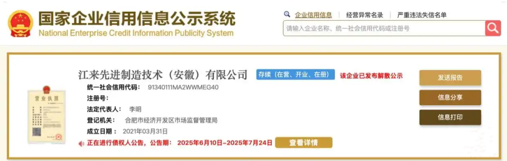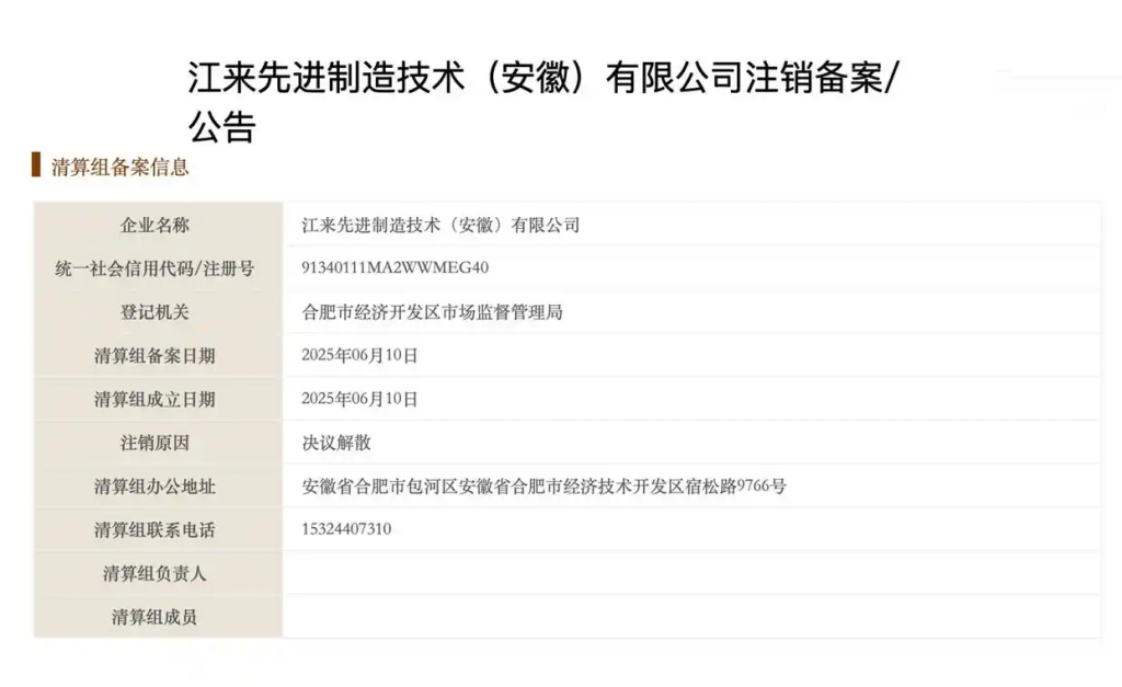 国家企业信用信息公示系统上,近日出现了江来先进制造技术(安徽)有限公司新增 1 条注销备案公告,注销原因为“决议解散”,公告期为6月10日至7月24日。