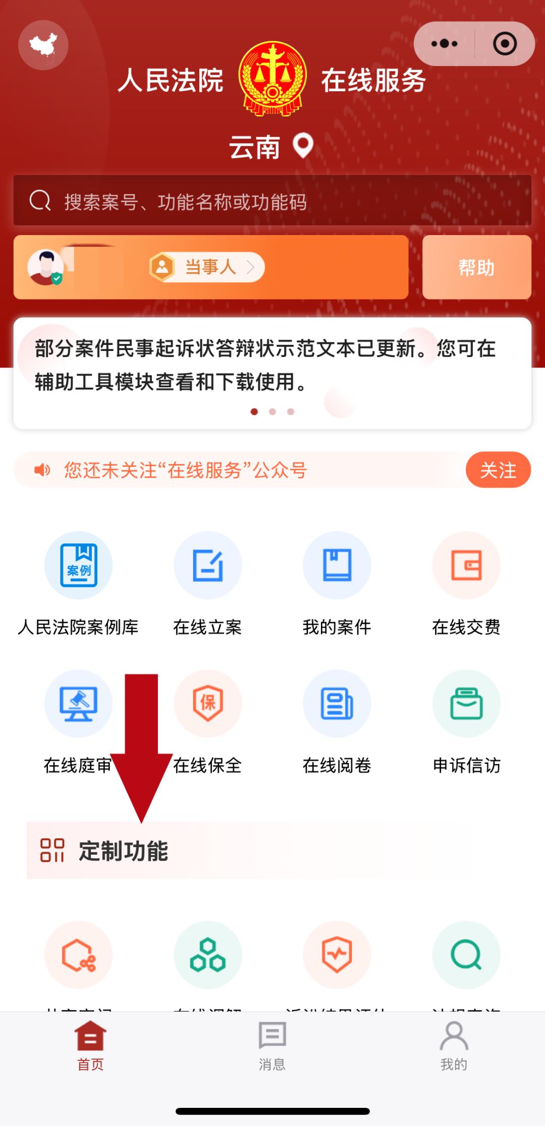 微信搜索"人民法院在线服务云南"→进入"定制功能"→点击"文书模板"→选择所需文本