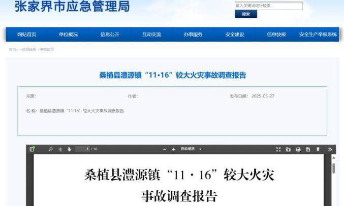 2024年11月16日04时30分许,湖南省张家界市桑植县澧源镇八一路一住宅发生火灾,导致7人死亡,过火面积约300平方米,经济损失约871万元。近期,张家界市应急管理局网站公布了《桑植县澧源镇“11·16”较大火灾事故调查报告》。