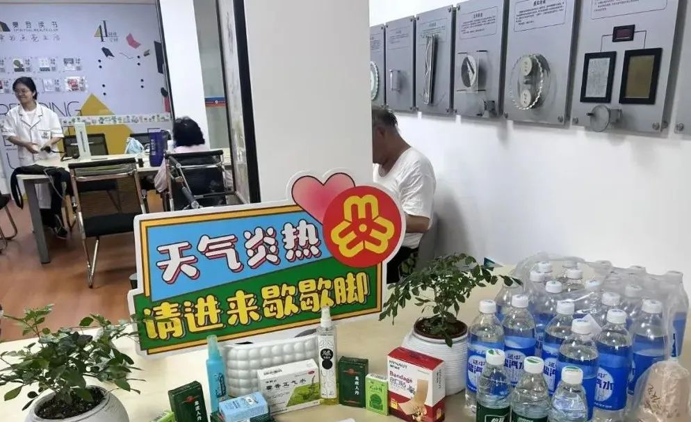 接力站内,早已备好了免费的祛湿茶、棒冰、盐汽水,以及风油精、清凉油等防暑降温物品,户外工作者可根据实际情况自由选择。一位正在歇脚的环卫工人说:“今年夏天特别热,我们在这里做保洁,高温的时候就来歇歇脚。睦邻中心蛮好的,送水给我们喝,还有茶,中午和下午都来缓一缓。”