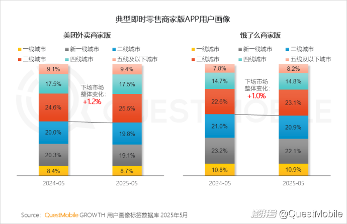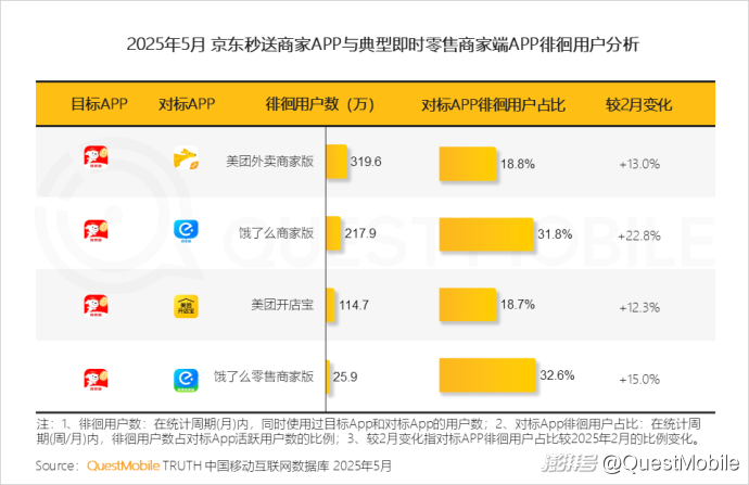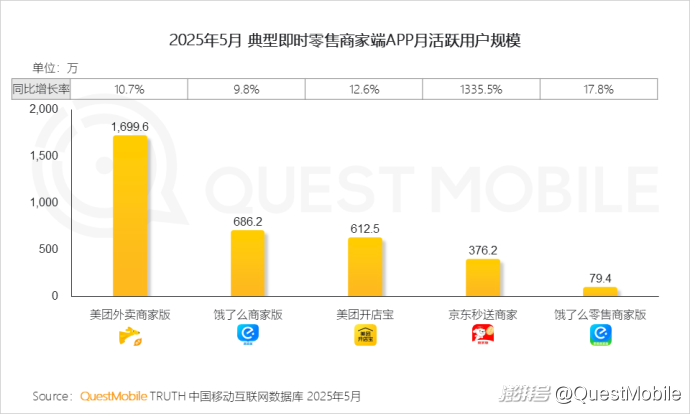 QuestMobile数据显示,截止2025年5月,美团外卖商家版APP月活跃用户规模近1700万,饿了么商家版、美团开店宝APP月活跃用户规模均超600万,京东秒送商家APP月活跃用户规模达376万,同比提升超13倍。