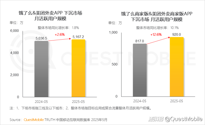 2、下沉市场成为外卖行业新增长引擎QuestMobile数据显示,下沉市场中,饿了么与美团外卖APP总体去重用户规模已达5167万,同比增速2.6%,优于整体市场;饿了么商家版与美团外卖商家版下沉市场总体去重用户规模达920万,同比增速12.6%,亦优于整体市场增长表现。