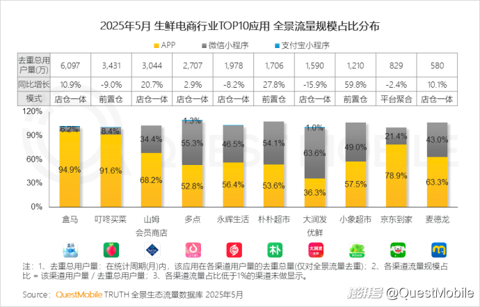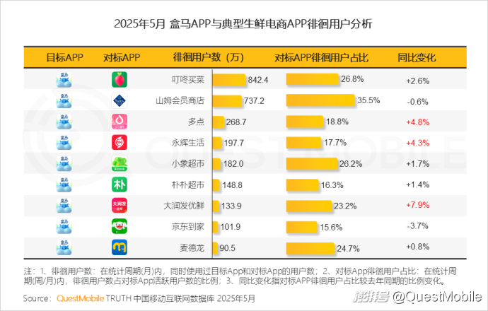 10、伴随生鲜即时配送需求的增加,平台间流量竞争加剧QuestMobile数据显示,2025年5月,盒马与叮咚买菜、山姆会员商店APP徘徊用户数较高,且大润发优鲜、多点、永辉生活等以线下为主的生鲜平台与盒马APP的徘徊用户比例进一步提升,反映出店仓一体模式下的激烈流量竞争。