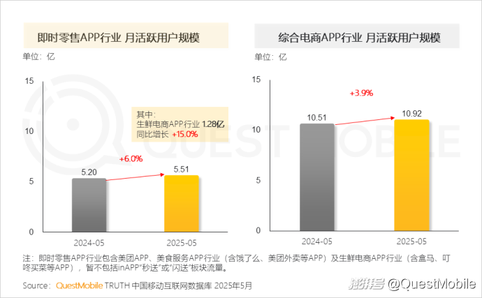 QuestMobile数据显示,截止到2025年5月份,即时零售APP行业月活跃用户规模达到5.51亿,同比增长了6%,其中,生鲜电商APP行业月活用户规模达到1.28亿,同比增长了15%。