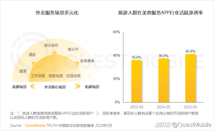 4、用户消费场景多元化与生活方式变迁,促进外卖服务边界的拓展QuestMobile数据显示,旅游场景中用户对美食服务渗透持续提升,2025年5月,旅游人群在美食服务APP行业活跃渗透率已达40.8%,较去年同期提升3.9%。