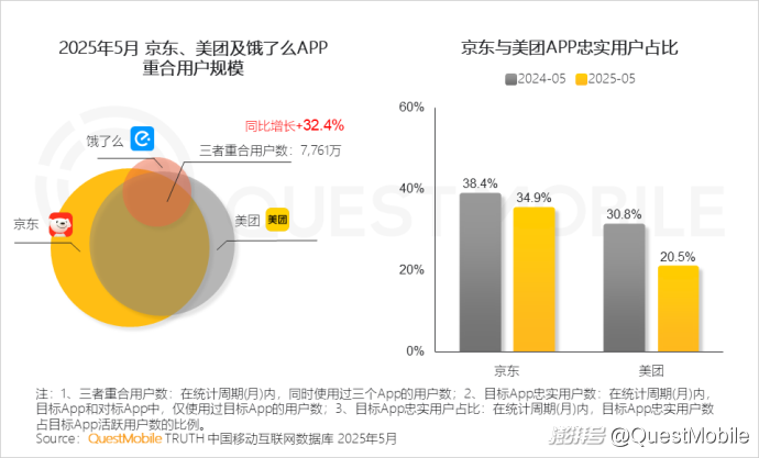 QuestMobile数据显示,2025年5月,京东与美团、饿了么APP三者重合用户规模已达7761万,较去年同期增长32.4%;京东与美团APP各自忠实用户比例均出现下滑,展现出用户在多平台间对比使用的倾向加强。